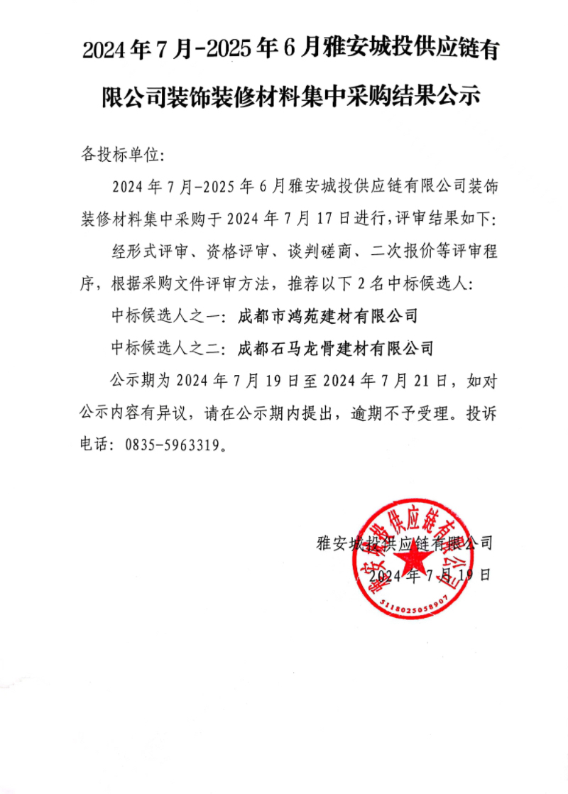 2024年7月-2025年6月雅安城投供應(yīng)鏈有限公司裝飾裝修材料集中采購(gòu)結(jié)果公示