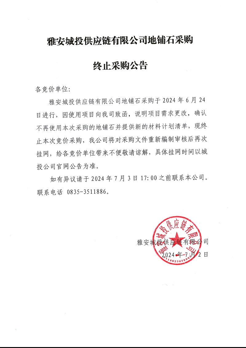 雅安城投供應(yīng)鏈有限公司地鋪石采購(gòu)終止采購(gòu)公告