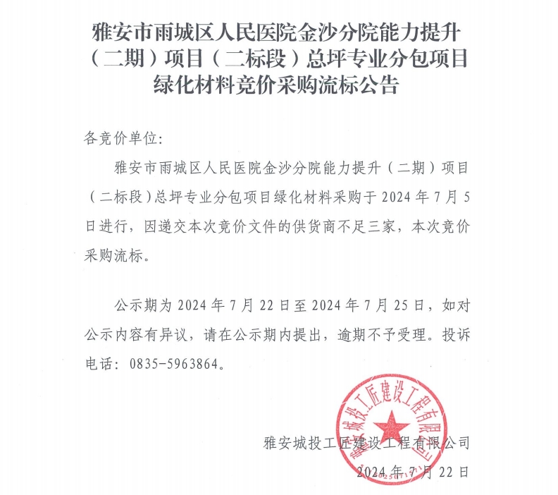 雅安市雨城區(qū)人民醫(yī)院金沙分院能力提升(二期)項(xiàng)目(二標(biāo)段)總坪專業(yè)分包項(xiàng)目綠化材料競(jìng)價(jià)采購(gòu)流標(biāo)公告