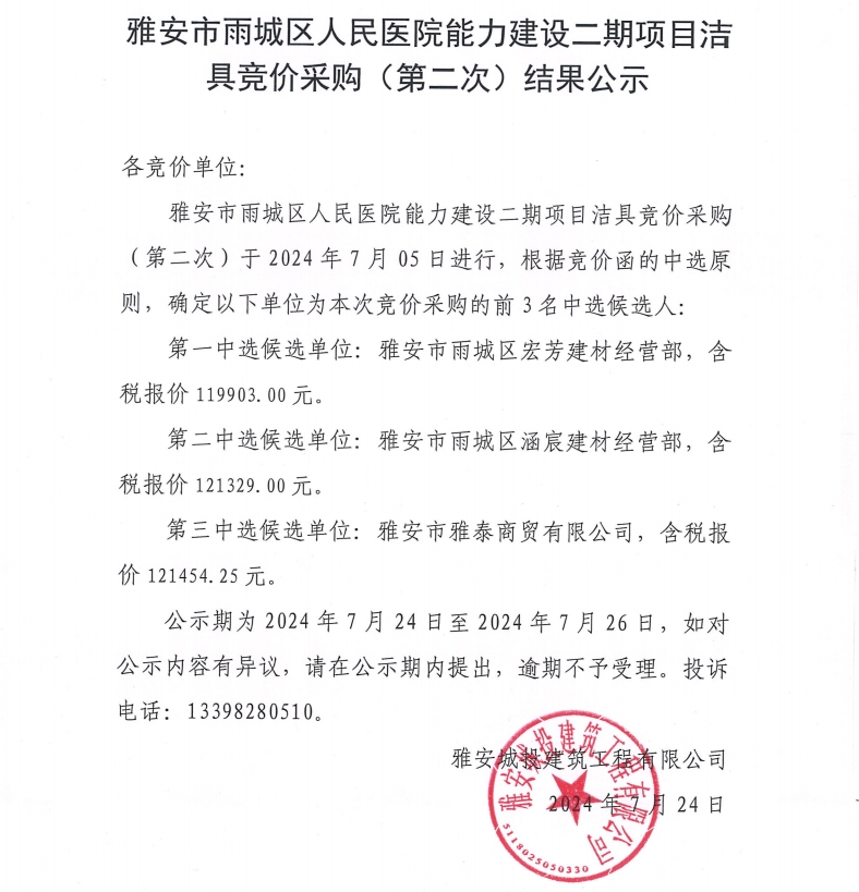 雅安市雨城區(qū)人民醫(yī)院能力建設(shè)二期項(xiàng)目潔具競(jìng)價(jià)采購(gòu)(第二次)結(jié)果公示