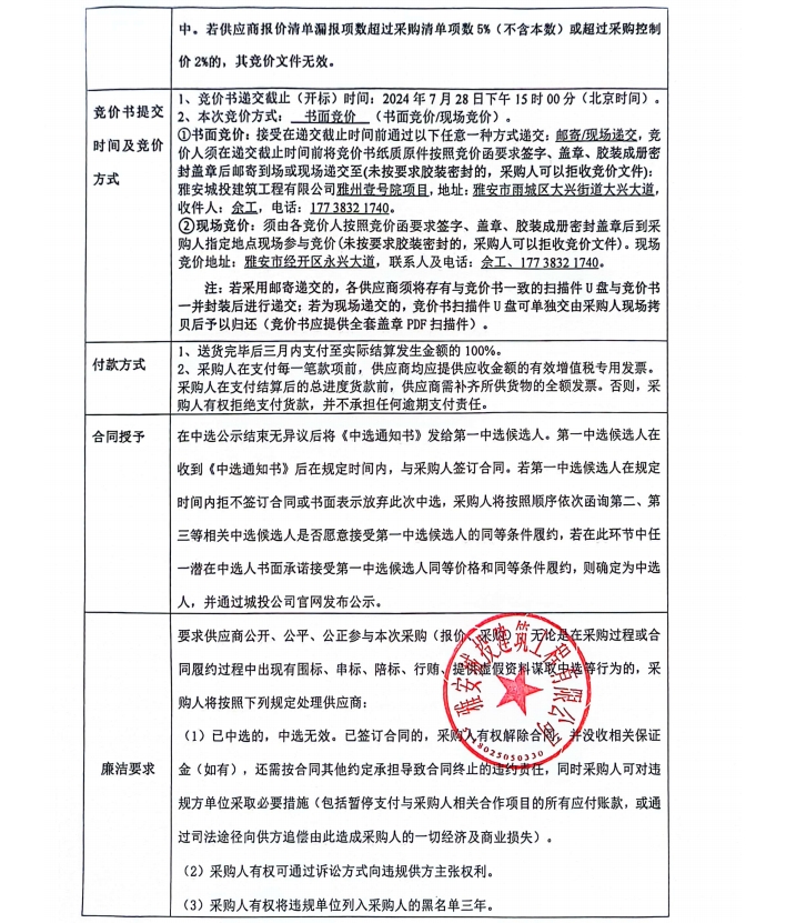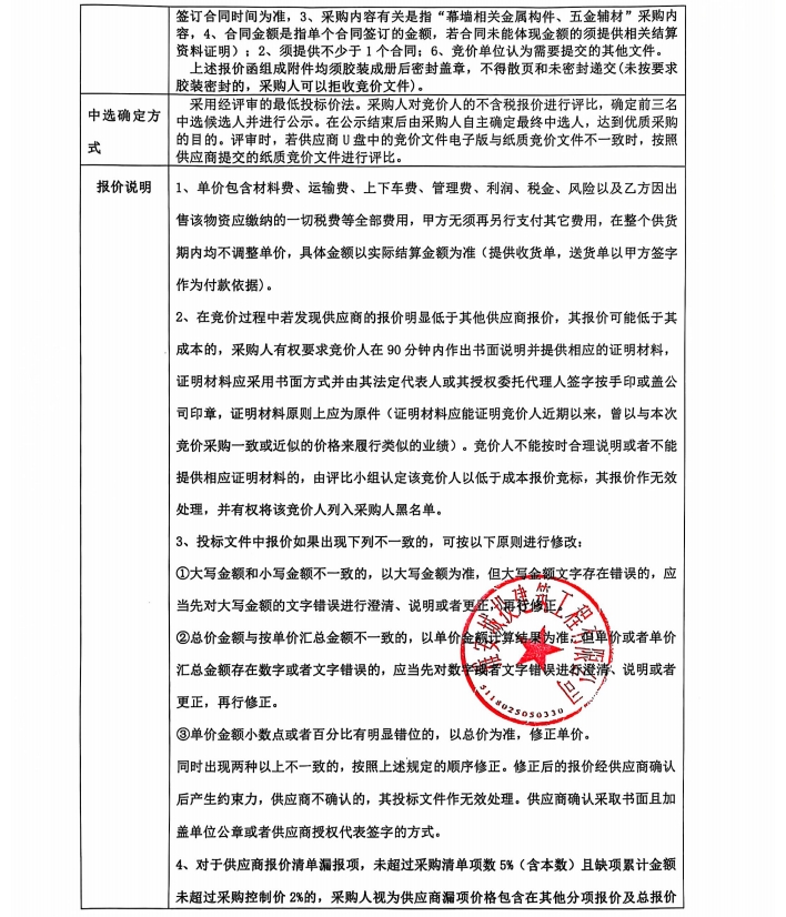 雅州壹號院項目幕墻輔材采購競價公告