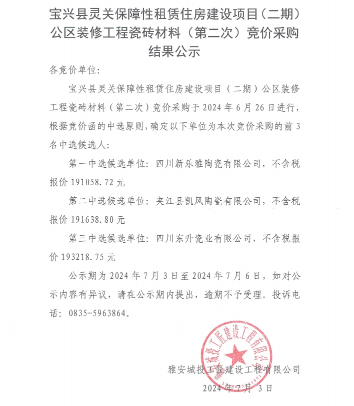 寶興縣靈關(guān)保障性租賃住房建設(shè)項(xiàng)目(二期)公區(qū)裝修工程瓷磚材料(第二次)競價采購結(jié)果公示)