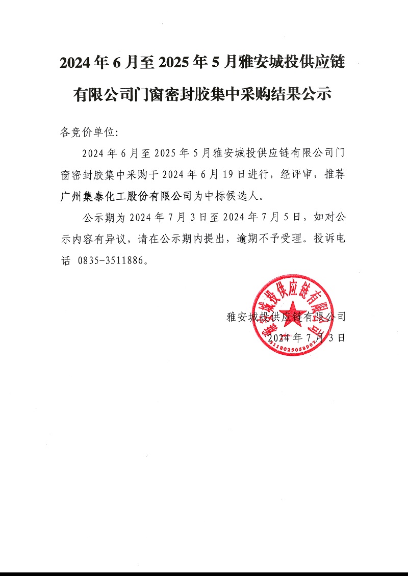 2024年6月至2025年5月雅安城投供應鏈有限公司門窗密封膠集中采購結果公示