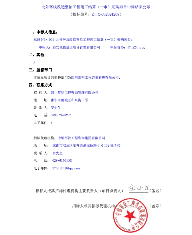 北外環(huán)線改造整治工程竣工結(jié)算(一審)采購項目中標(biāo)結(jié)果公示