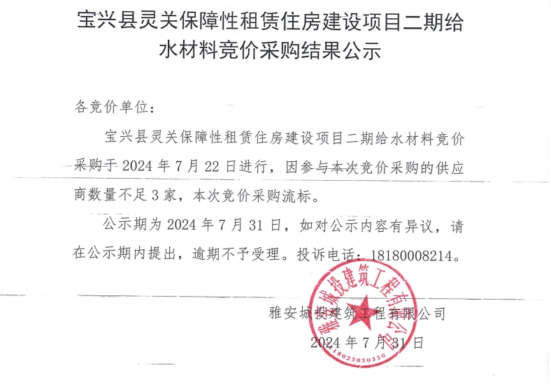 寶興縣靈關(guān)保障性租賃住房建設(shè)二期給水材料競(jìng)價(jià)采購(gòu)結(jié)果公示
