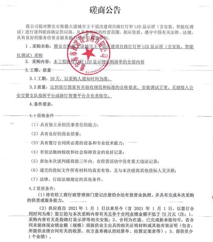 雅安市熊貓大道城市主干道改建項目路燈燈桿LED顯示屏(含安裝、智能化調(diào)試)磋商公告