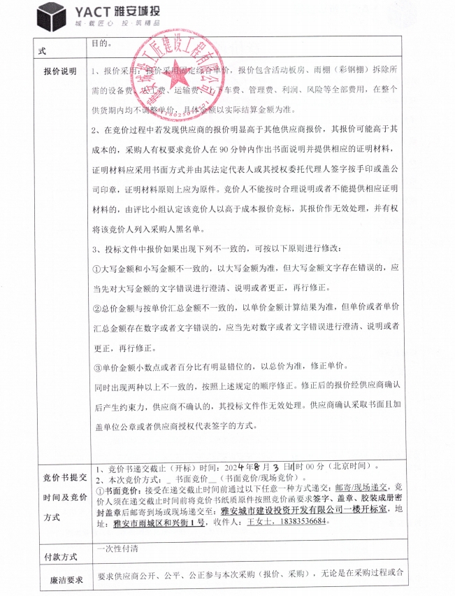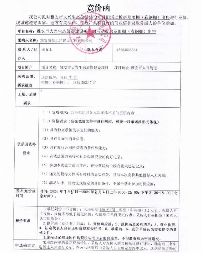 雅安市大興生態(tài)旅游建設項目舊活動板房出售競價函