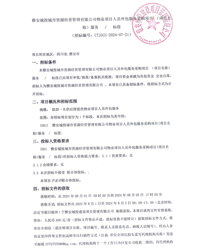 雅安城投城市資源經(jīng)營管理有限公司物業(yè)項(xiàng)目人員外包服務(wù)采購項(xiàng)目(項(xiàng)目名稱)服務(wù)/標(biāo)段公告