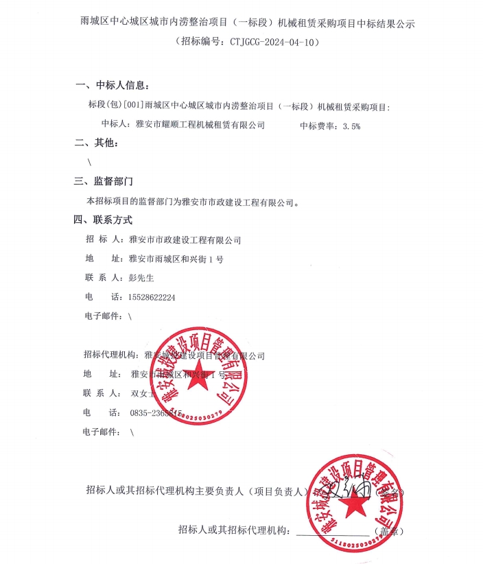 雨城區(qū)中心城區(qū)城市內(nèi)澇整治項目(一標(biāo)段)機械租賃采購項目中標(biāo)結(jié)果公示