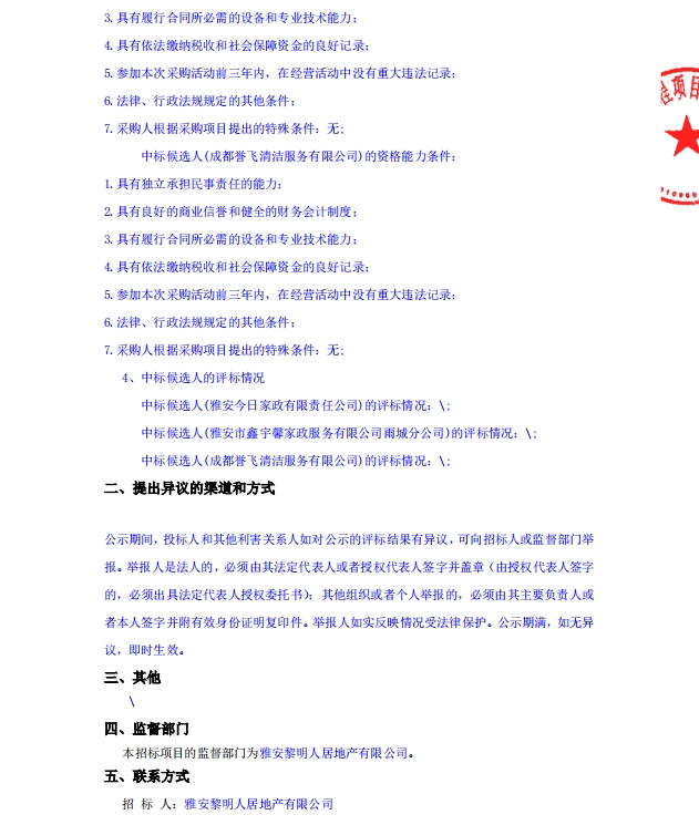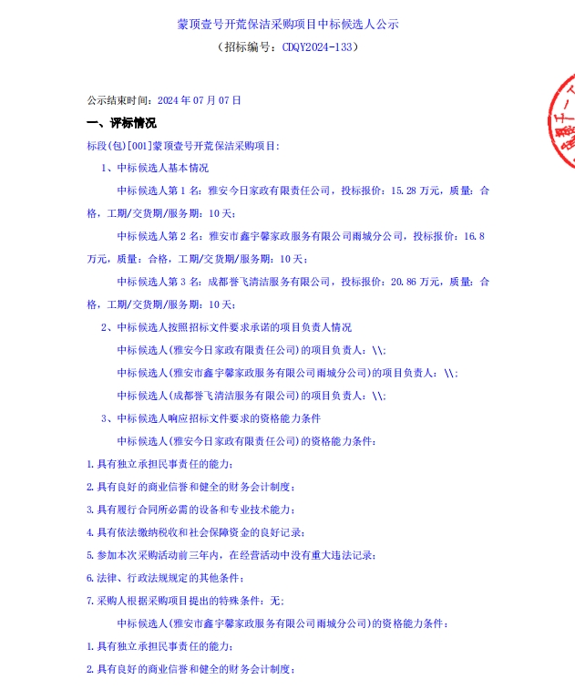 蒙頂壹號(hào)開荒保潔采購(gòu)項(xiàng)目中標(biāo)候選人公示