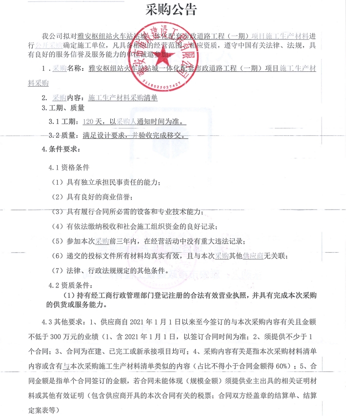 雅安樞紐站火車(chē)站站城一體化配套市政道路工程(一期)項(xiàng)目施工生產(chǎn)材料采購(gòu)公告