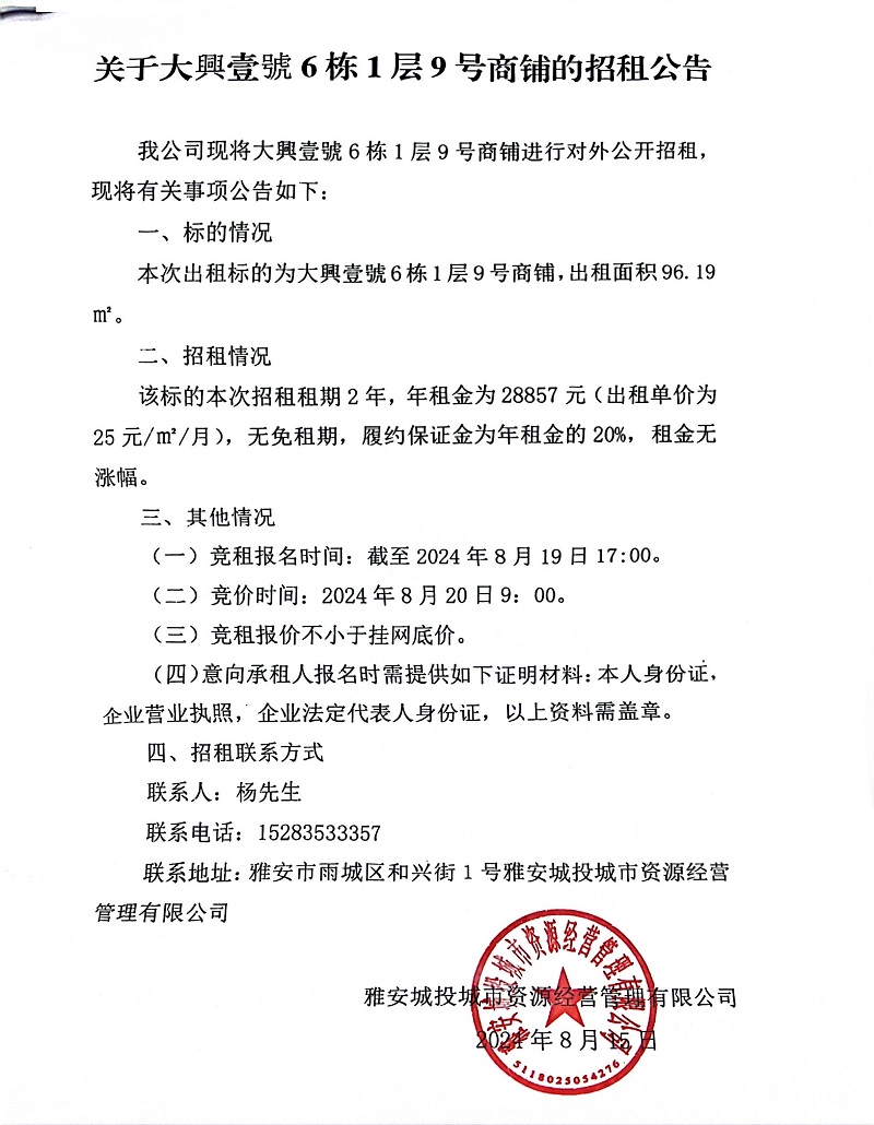 關(guān)于大興壹號(hào)6棟1層9號(hào)商鋪的招租公告