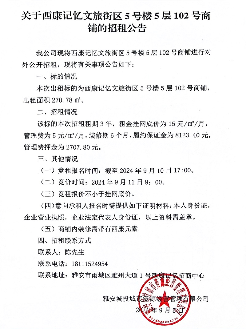 關(guān)于西康記憶文旅街區(qū)5號樓5層102號商鋪的招租公告