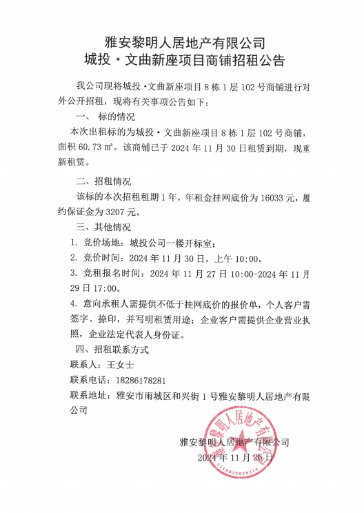 雅安黎明人居地產(chǎn)有限公司城投·文曲新座項目商鋪招租公告