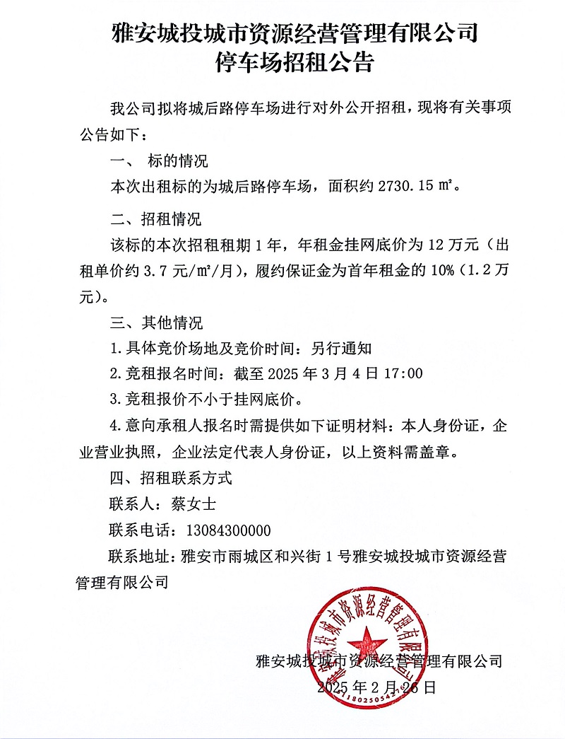 雅安城投城市資源經(jīng)營(yíng)管理有限公司停車(chē)場(chǎng)招租公告
