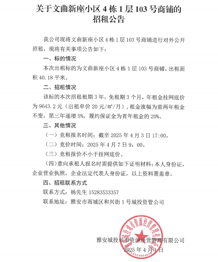 關于文曲新座小區(qū)4棟1層103號商鋪的招租公告