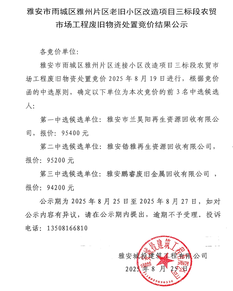 雅安市雨城區(qū)雅州片區(qū)老舊小區(qū)改造項目三標段農(nóng)貿(mào)市場工程廢舊物資處置競價結(jié)果公示
