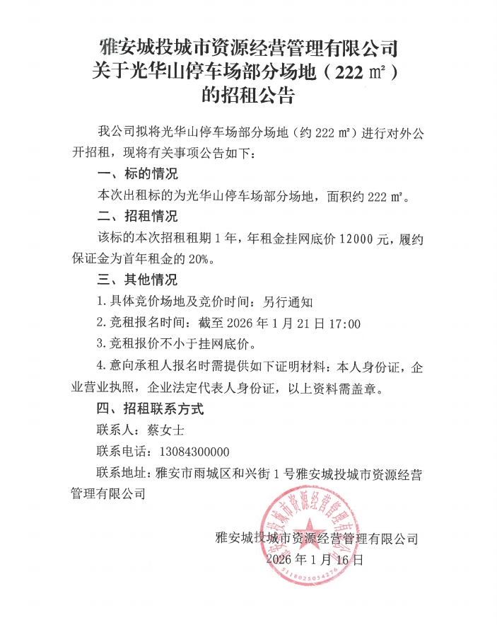 雅安城投城市資源經(jīng)營(yíng)管理有限公司關(guān)于光華山停車(chē)場(chǎng)部分場(chǎng)地(222㎡)的招租公告