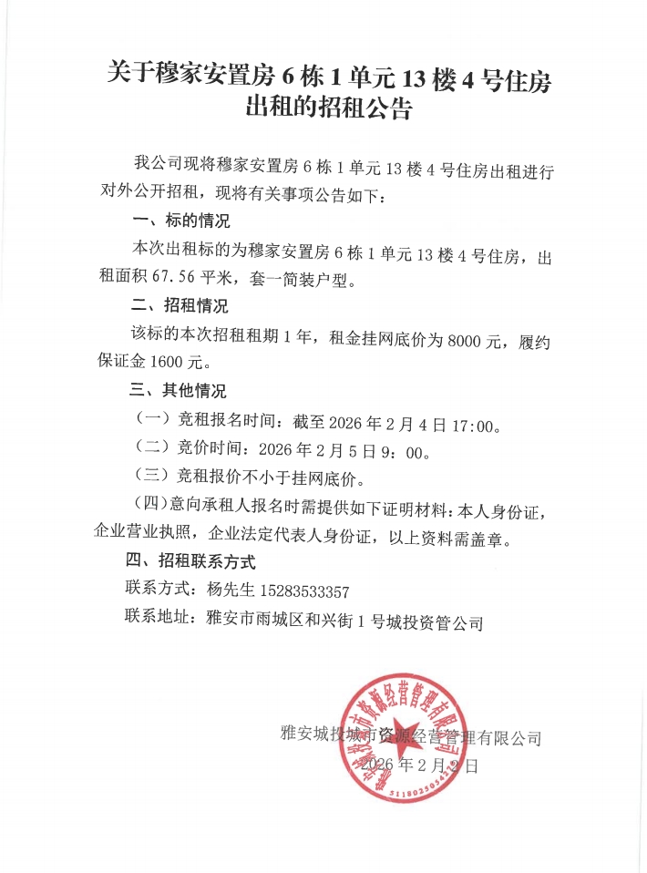 關(guān)于穆家安置房6棟1單元13樓4號(hào)住房出租的招租公告