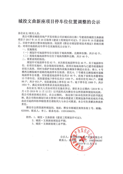 城投文曲新座項目停車位位置調(diào)整的公示