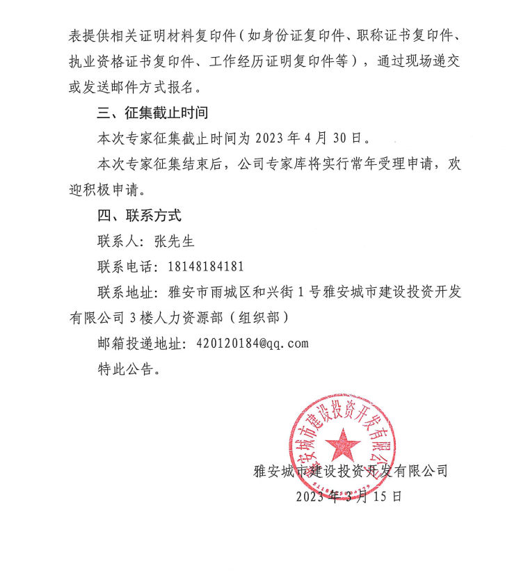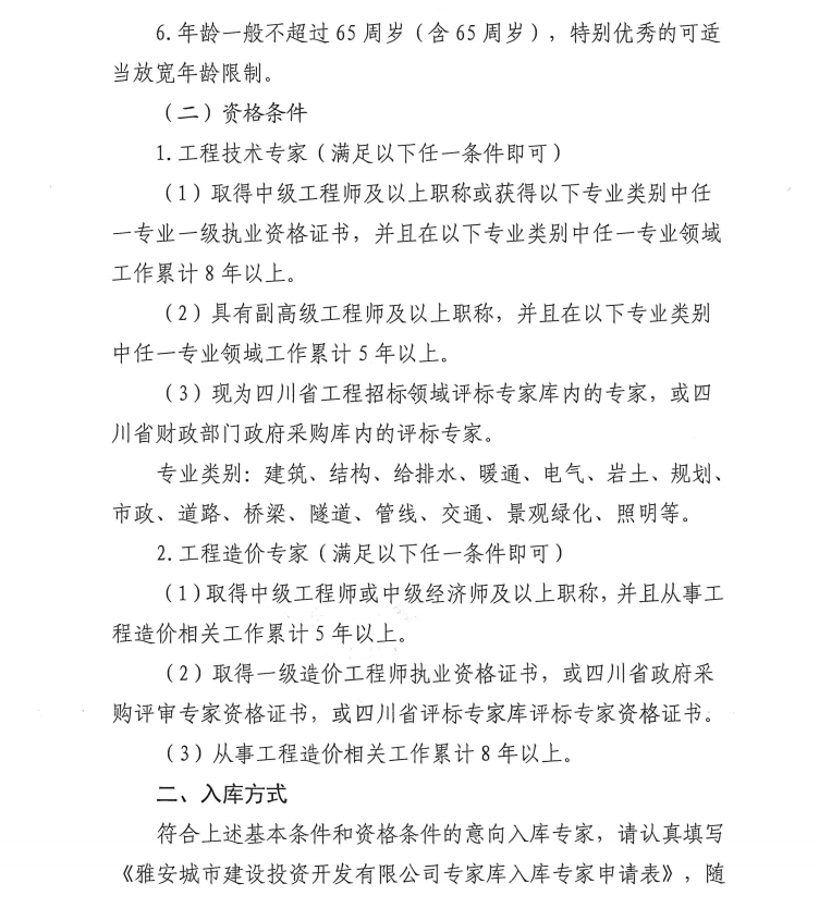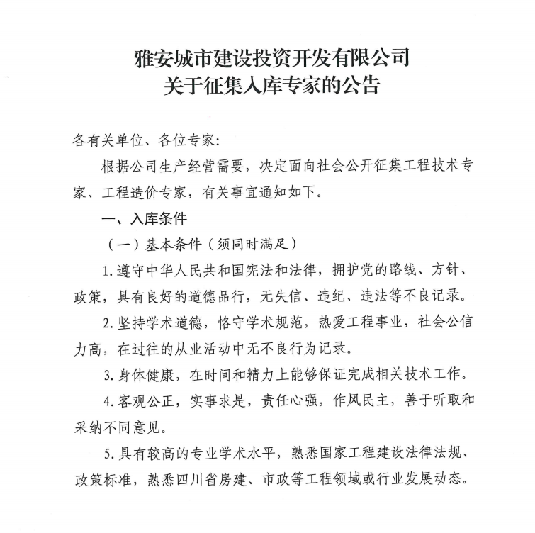 雅安城市建設(shè)投資開(kāi)發(fā)有限公司關(guān)于征集入庫(kù)專(zhuān)家的公告