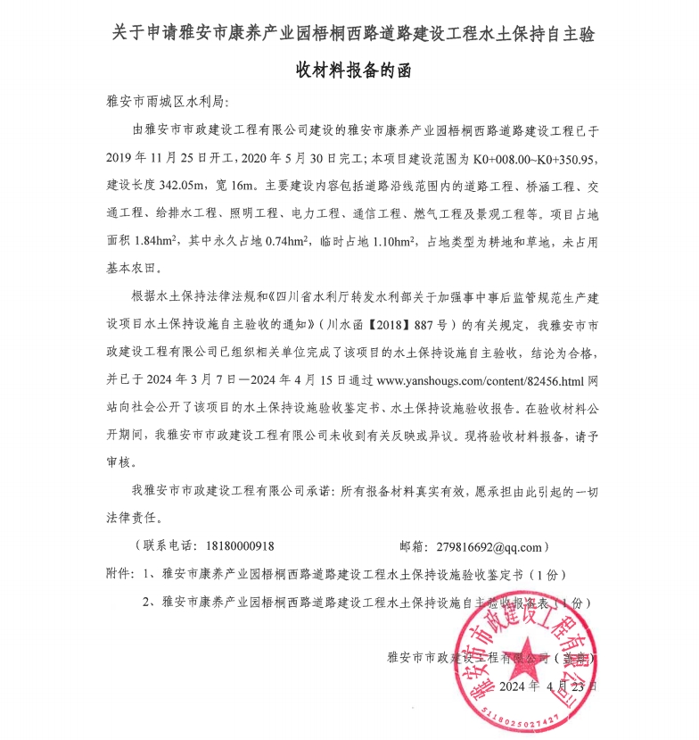 關(guān)于申請(qǐng)雅安市康養(yǎng)產(chǎn)業(yè)園梧桐西路道路建設(shè)工程水土保持自主驗(yàn)收材料報(bào)備的函