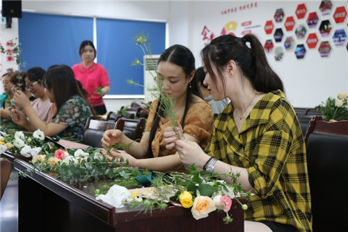 員工們緊盯花藝師邊學(xué)邊練,花枝高低錯(cuò)落、疏密有致、虛實(shí)結(jié)合……,現(xiàn)場(chǎng)氣氛非;钴S,一個(gè)個(gè)插花技巧華麗集合。經(jīng)過(guò)2小時(shí)的精心制作,一束束鮮花逐漸形成,大家看著自己的作品,充滿(mǎn)了成就感和喜悅感。